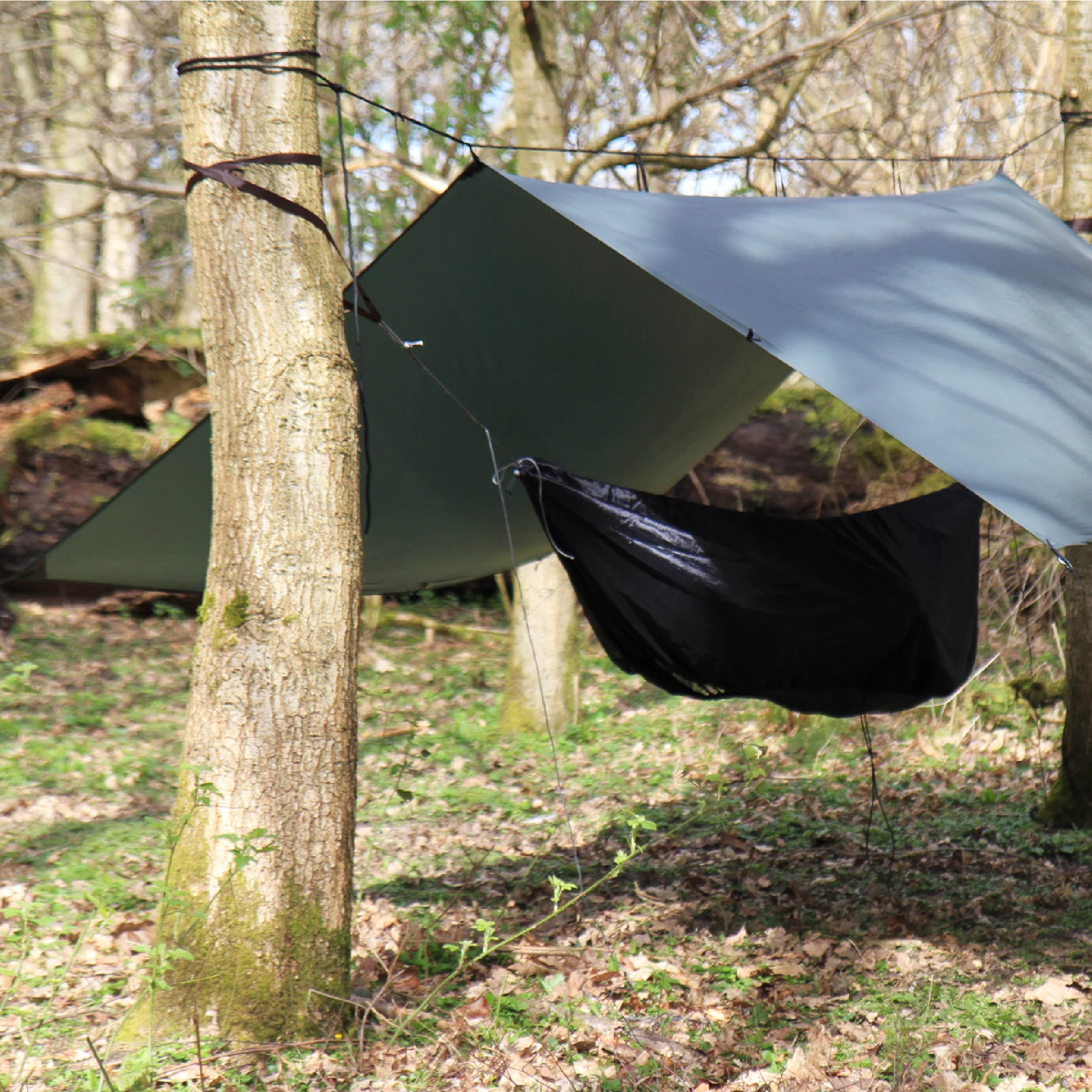 You don't need to buy anything else to get started. The hammock comes with suspension (7/64" Amsteel whoopie slings and tree huggers), the tarp includes 2mm reflective guy lines, and everything packs into its own silnylon stuff sack.