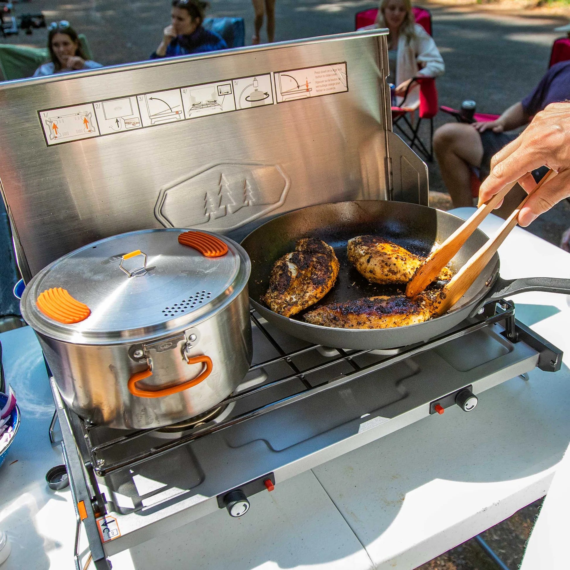 The 304 (18/8) stainless steel construction provides specific benefits for camping cooking: