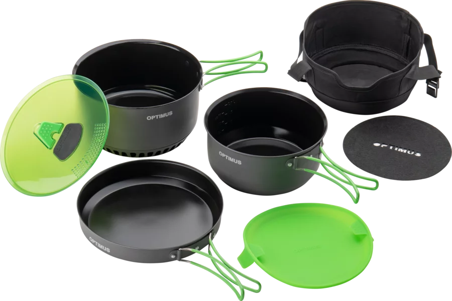 The Terra Camp 4 Pot Set is designed to keep up with the durability of Optimus reliable stoves. The rugged construction withstands repeated outdoor use. The hard-anodized finish maintains performance through years of camping.