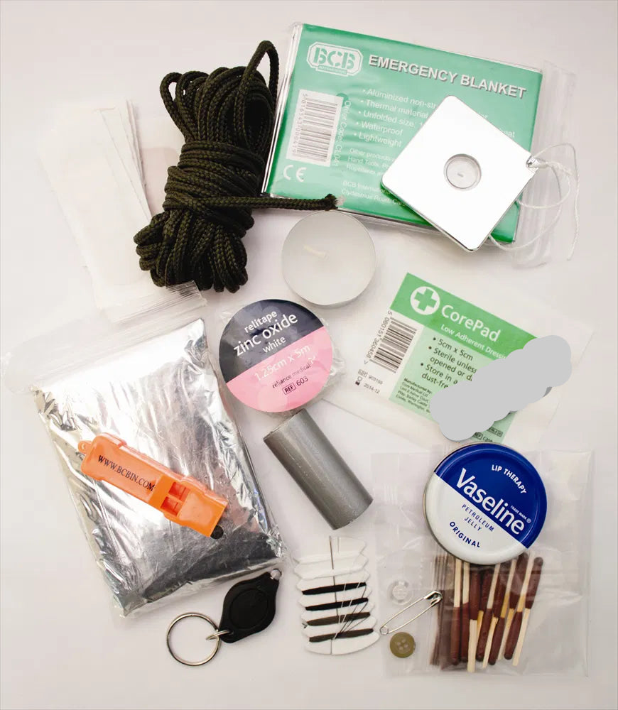 Key Items: Emergency poncho, LED micro torch, first aid supplies, repair kit